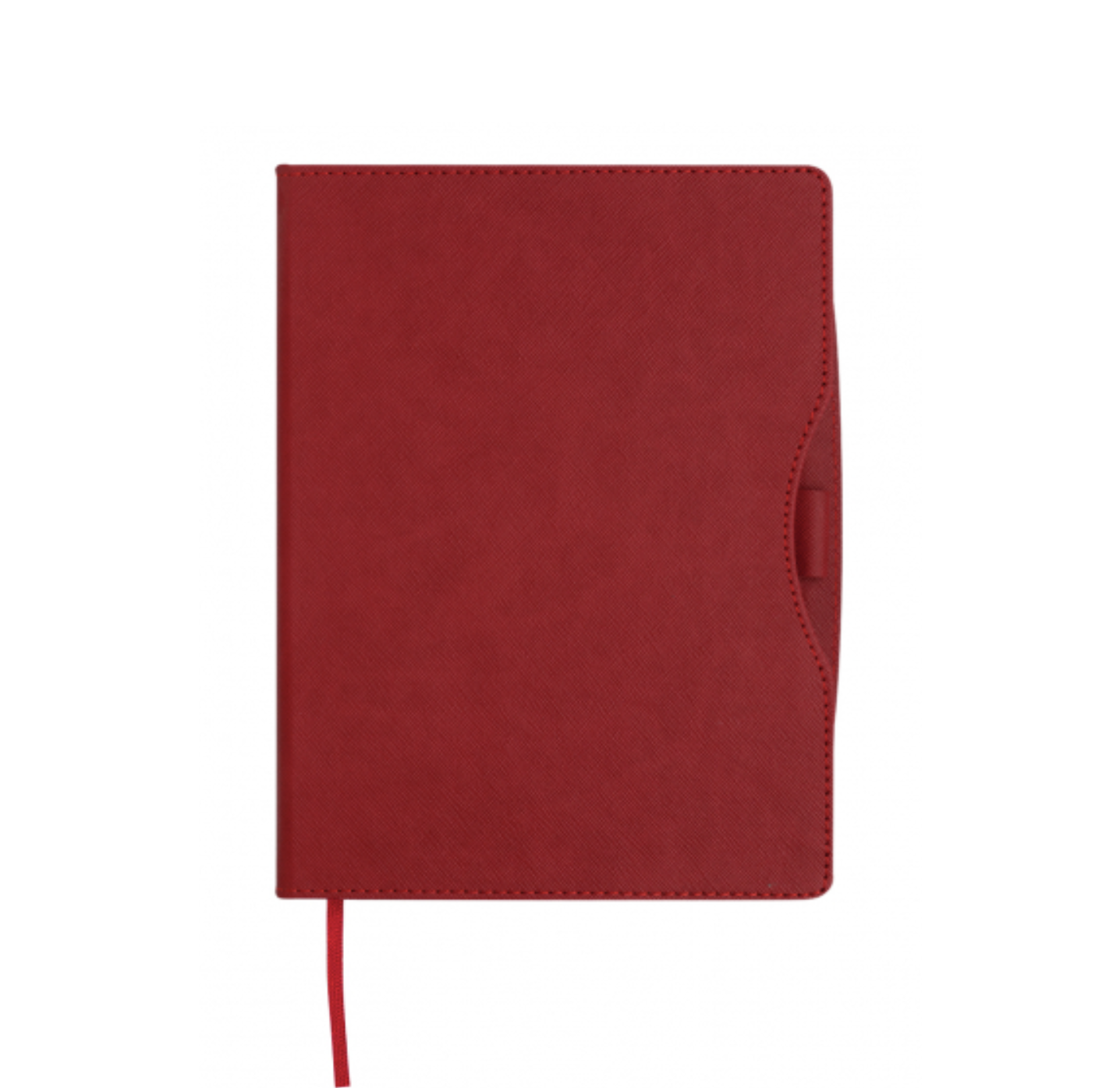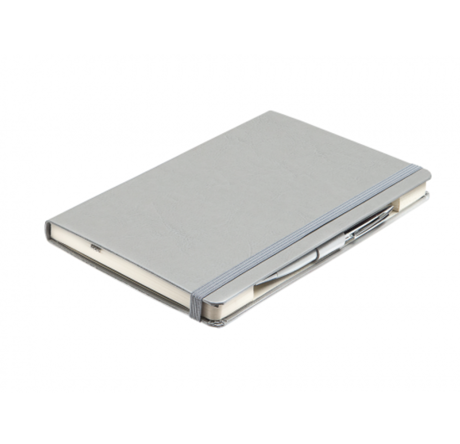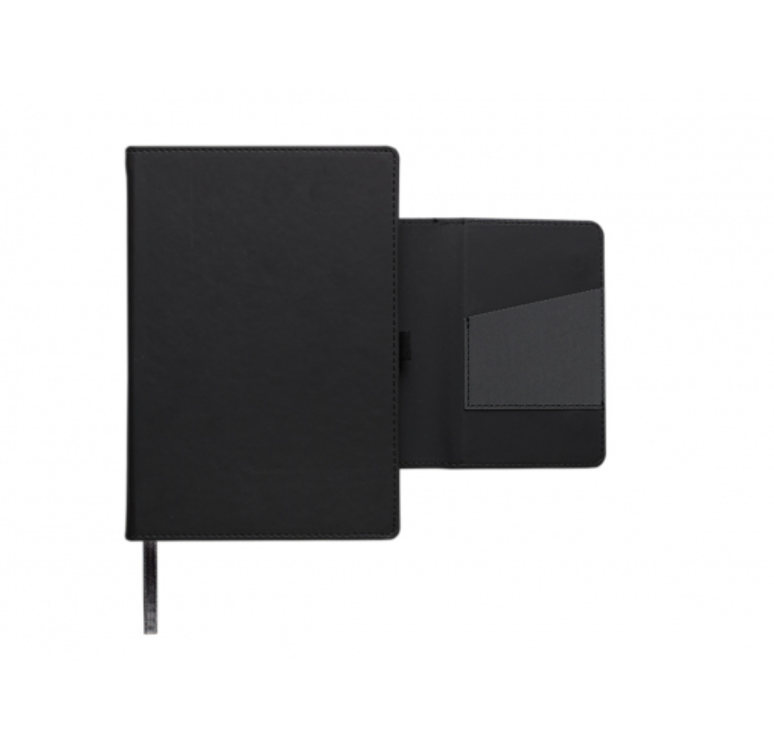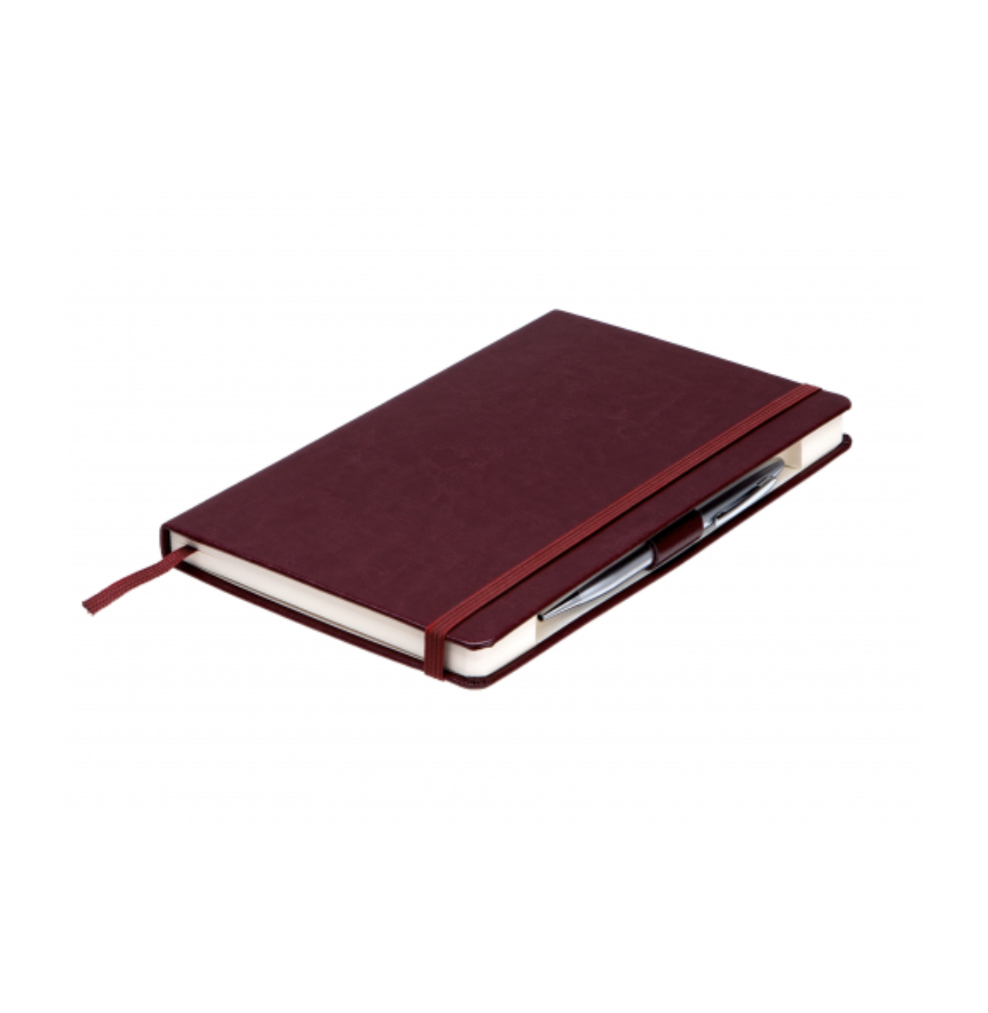 Блокнот формата А5 в мягкой обложке из искусственной кожи. Текстура — гладкая с имитацией натуральной кожи. Для удобства переноски ручки в корешке блокнота присутствует ниша, к которой ручка крепится за клип. Размеры: 210 х 154 мм. Блок из 192 страниц в линейку, бумага плотностью 80г/м2. Ляссе.