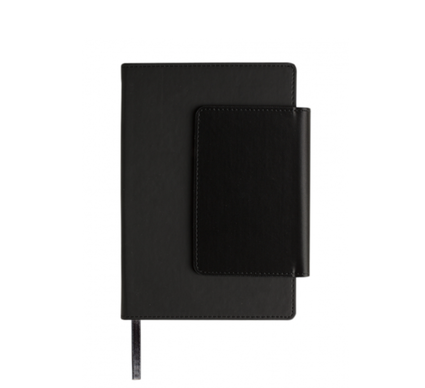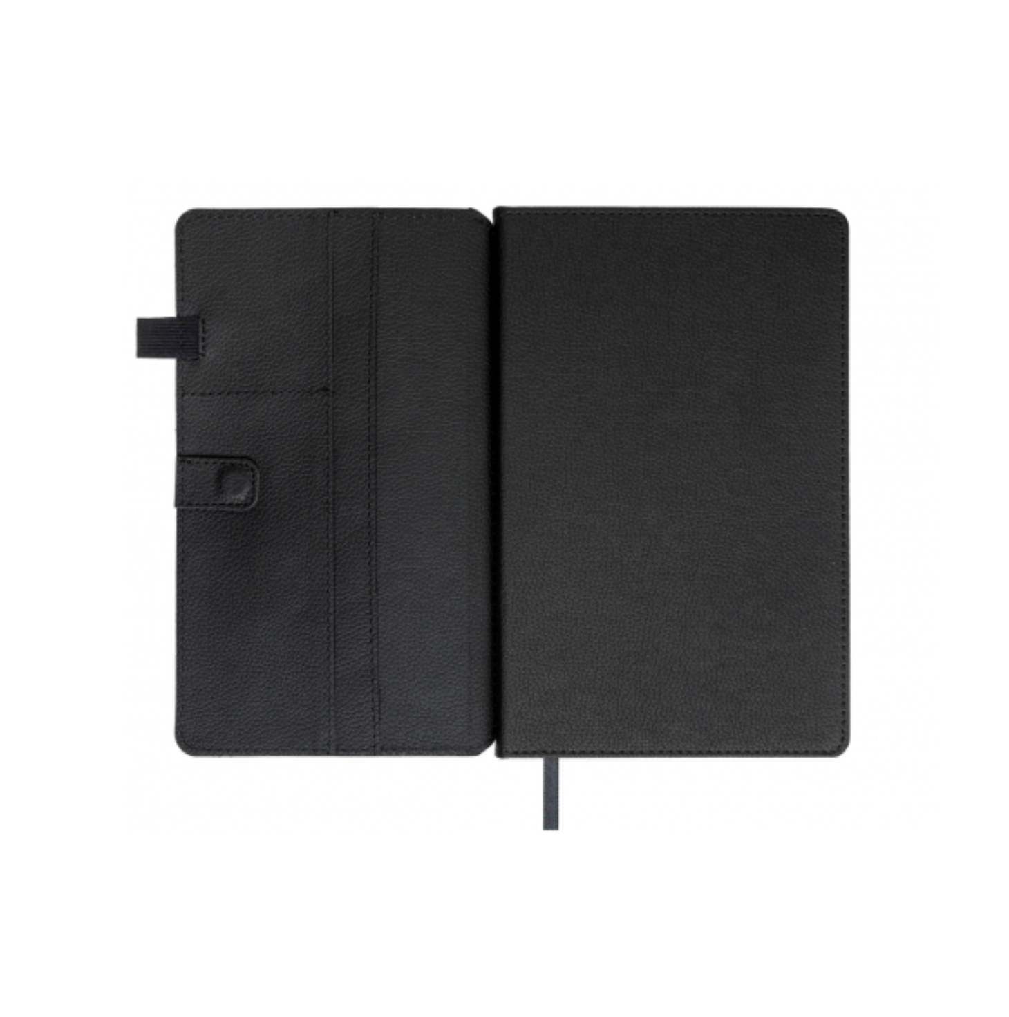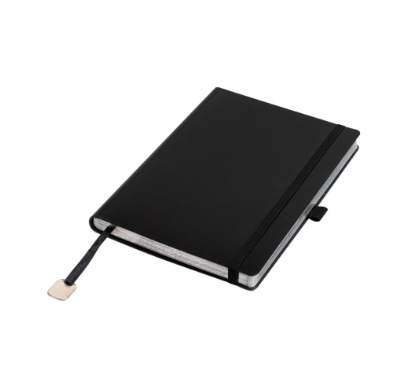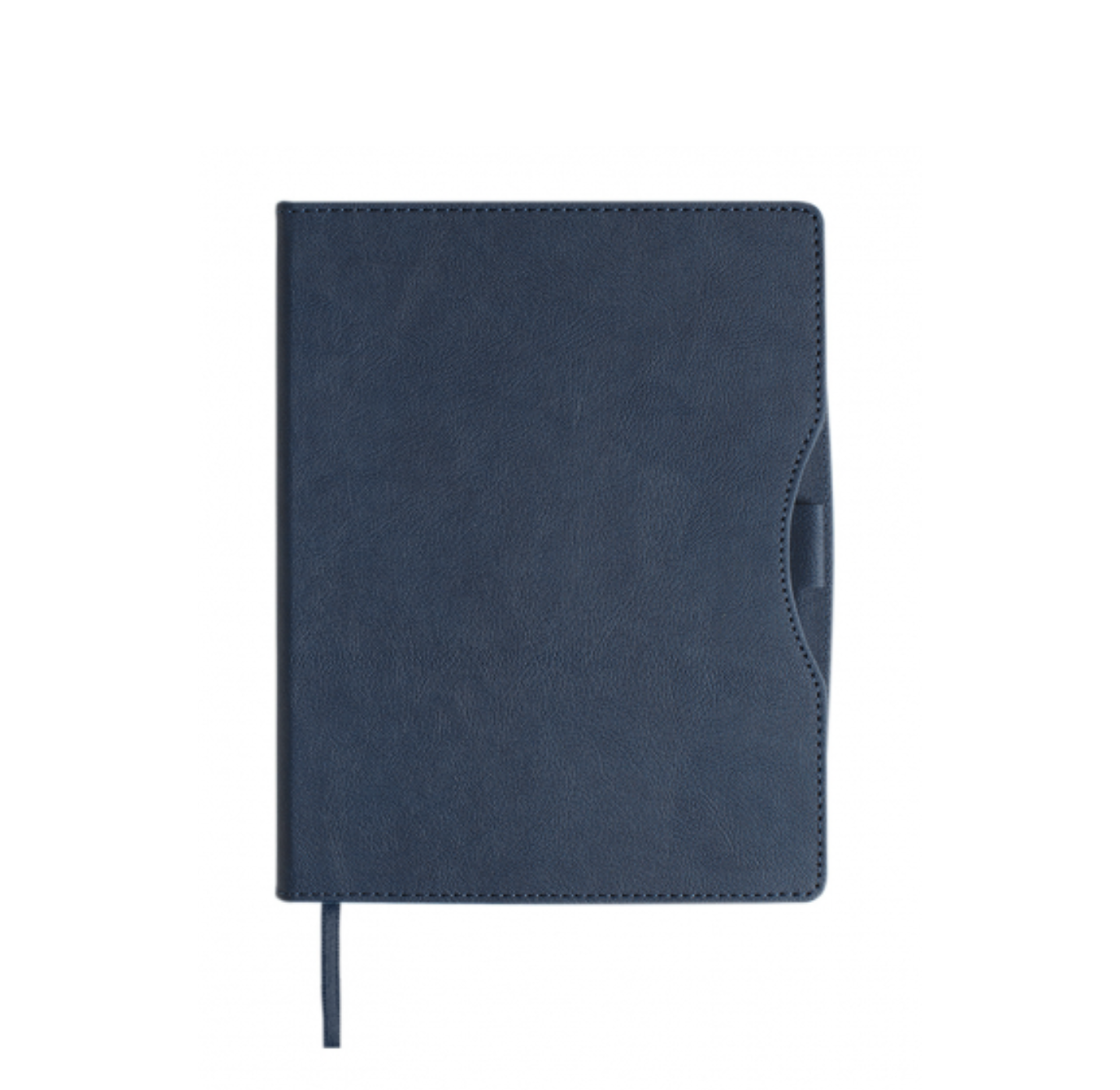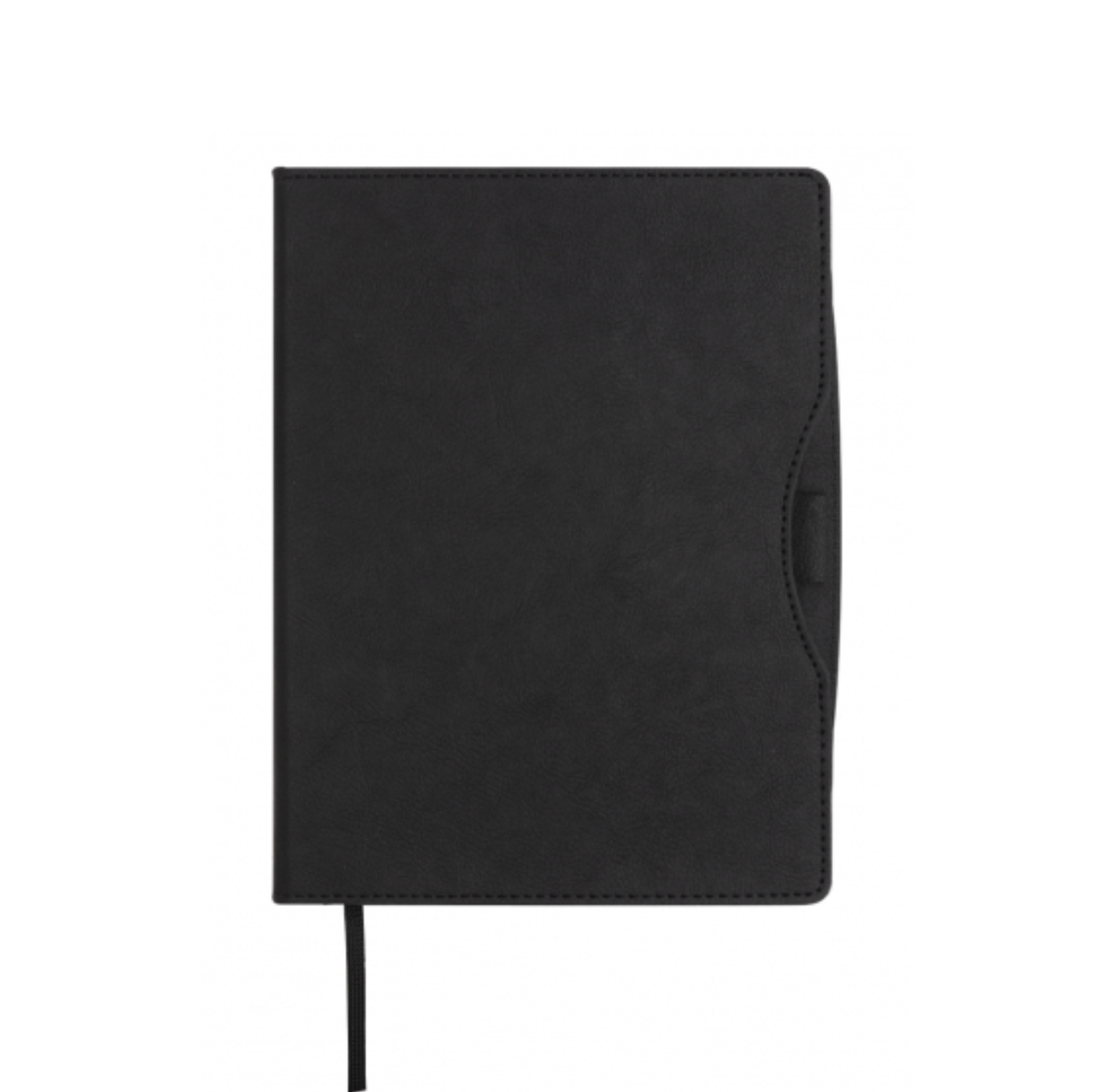 Блокнот формата А5 в мягкой обложке из искусственной кожи. Текстура — гладкая с имитацией натуральной кожи. Для удобства переноски ручки в корешке блокнота присутствует ниша, к которой ручка крепится за клип. Размеры: 210 х 154 мм. Блок из 192 страниц в линейку, бумага плотностью 80г/м2. Ляссе.