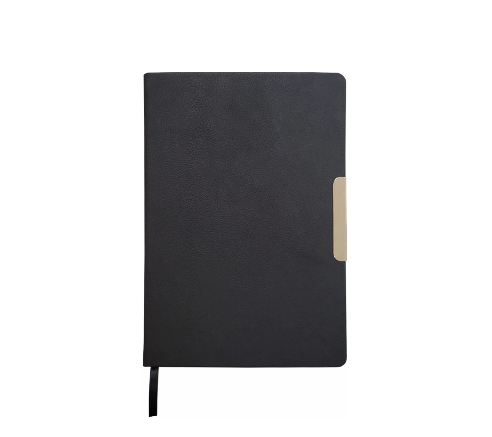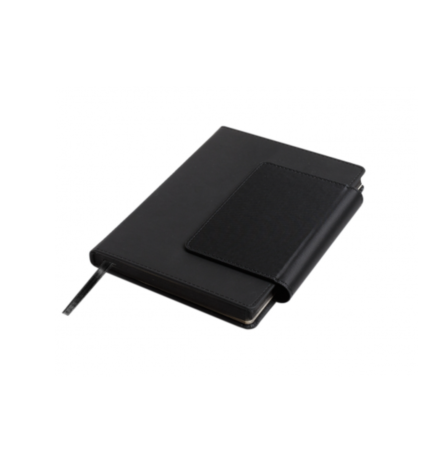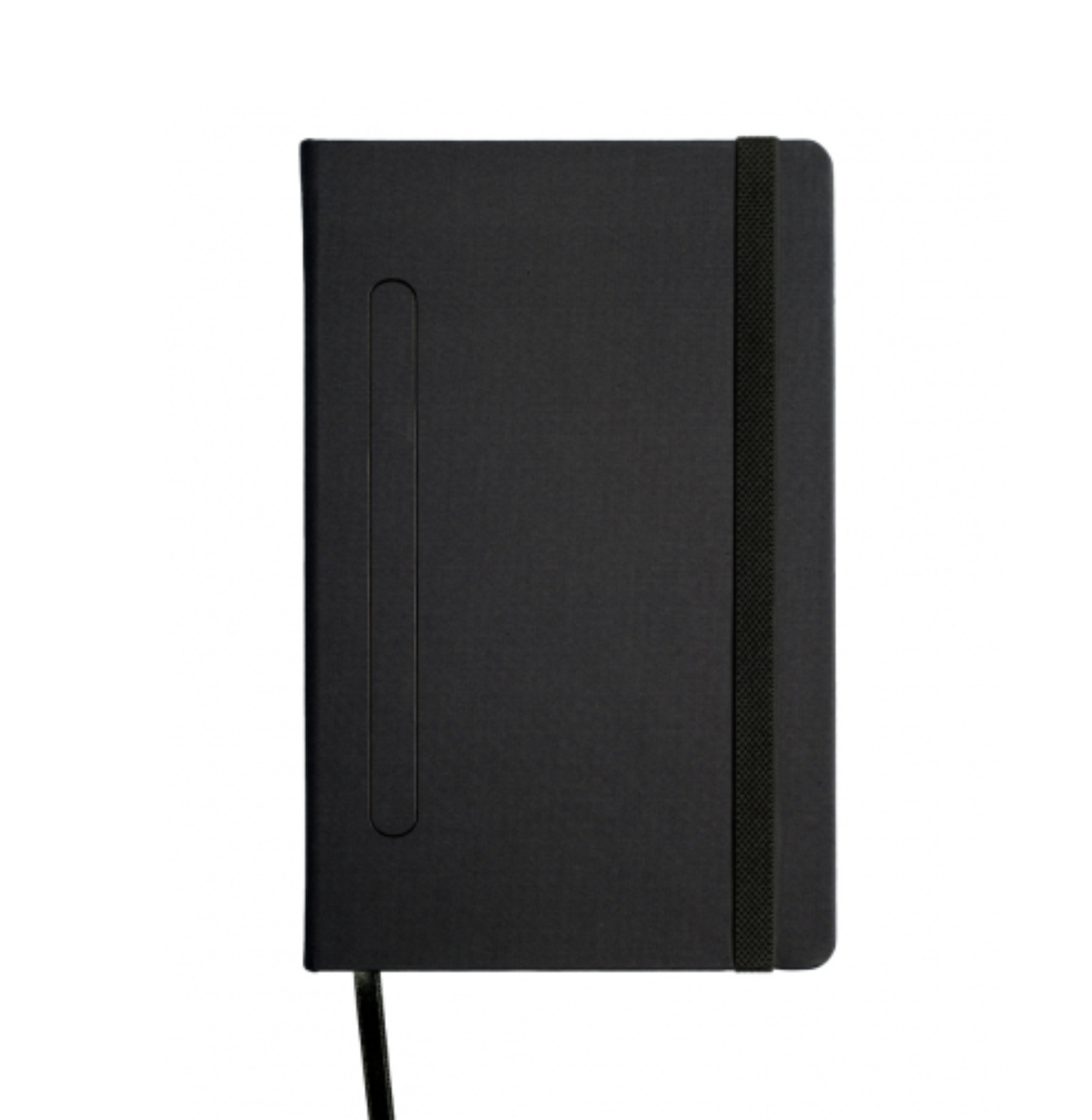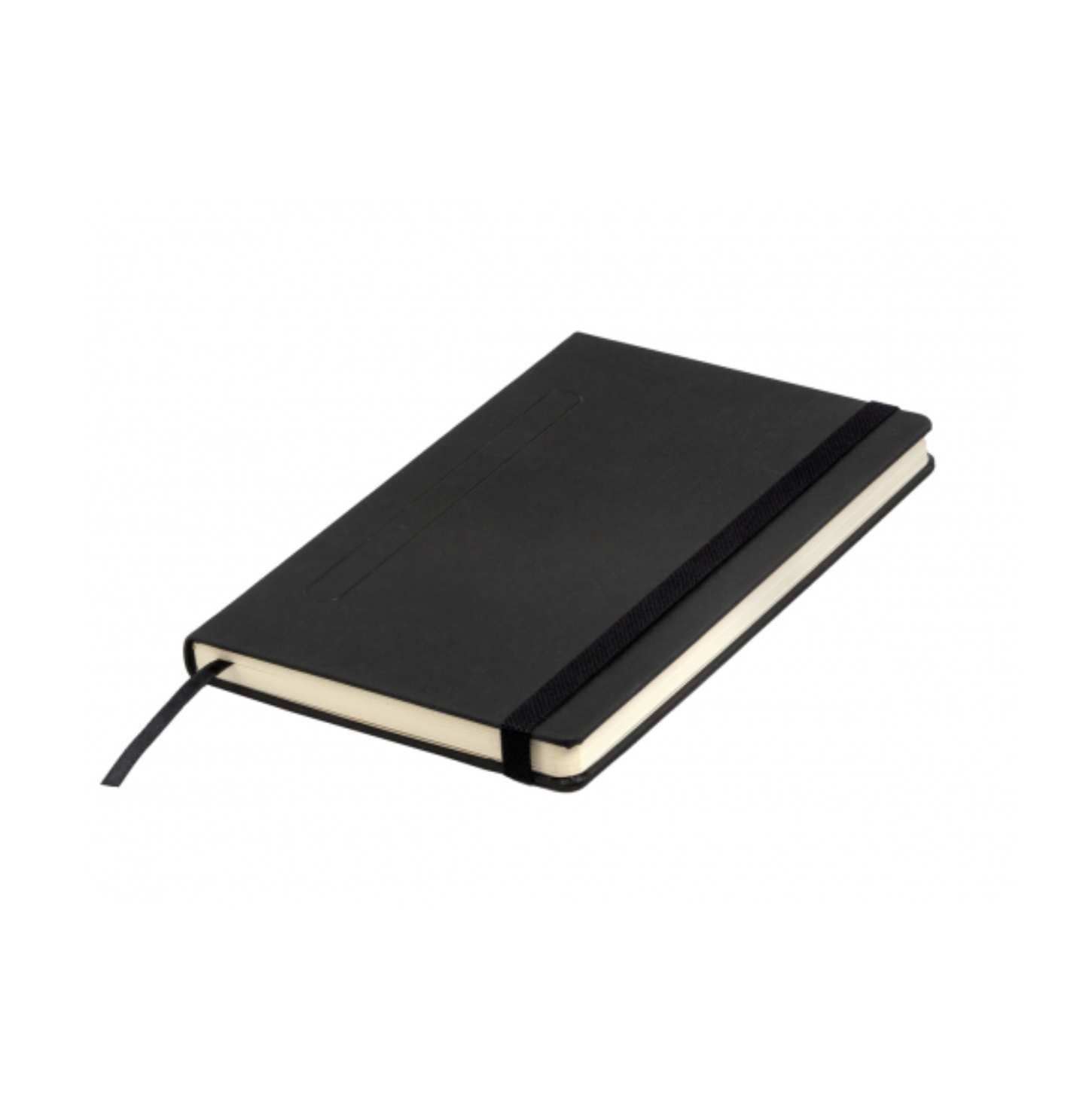 Блокнот формата А5 в мягкой обложке из искусственной кожи. Текстура — гладкая с имитацией натуральной кожи. Для удобства переноски ручки в корешке блокнота присутствует ниша, к которой ручка крепится за клип. Размеры: 210 х 154 мм. Блок из 192 страниц в линейку, бумага плотностью 80г/м2. Ляссе.