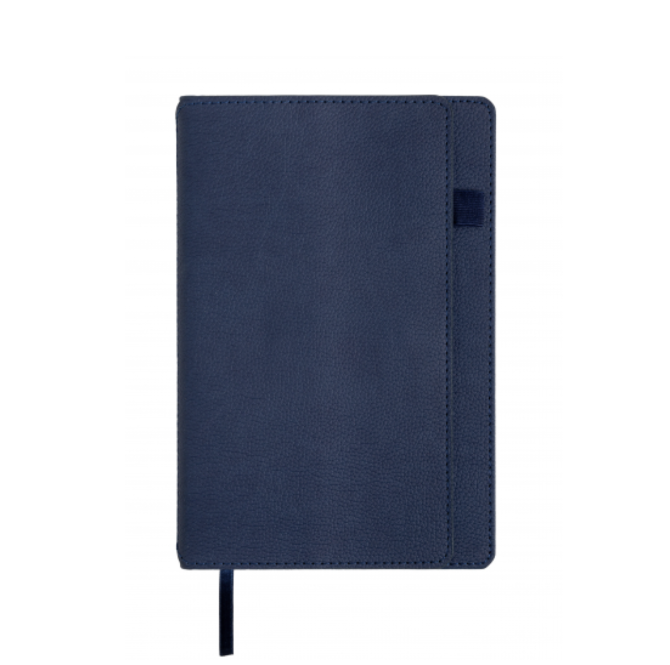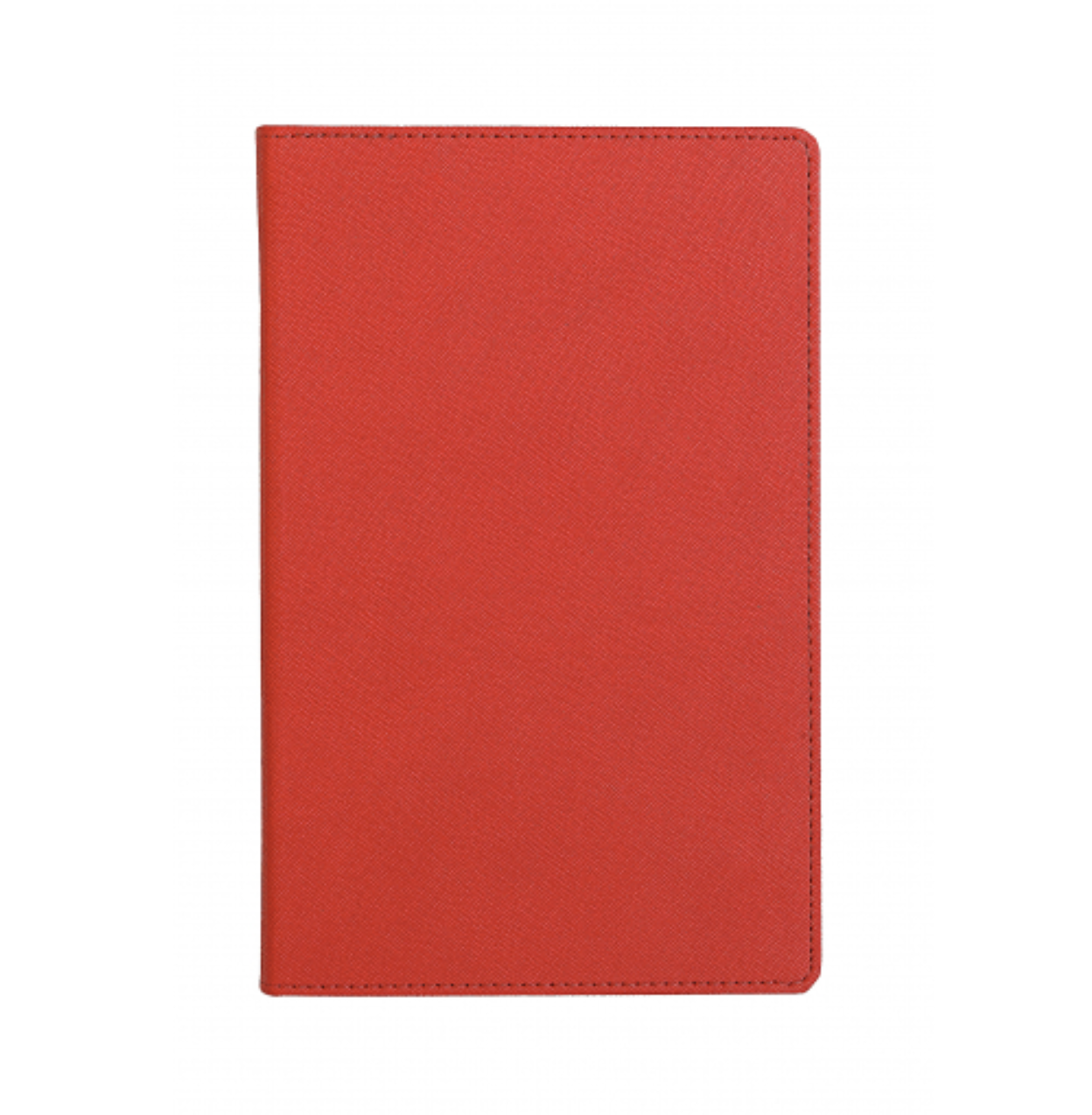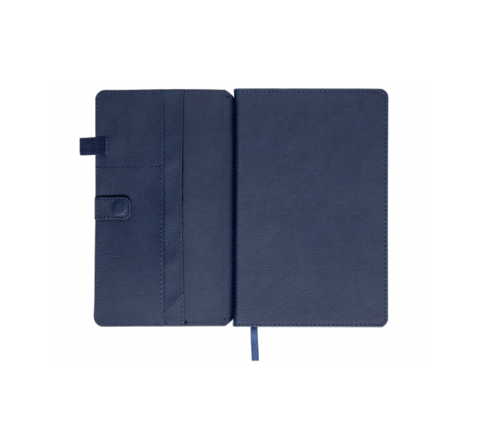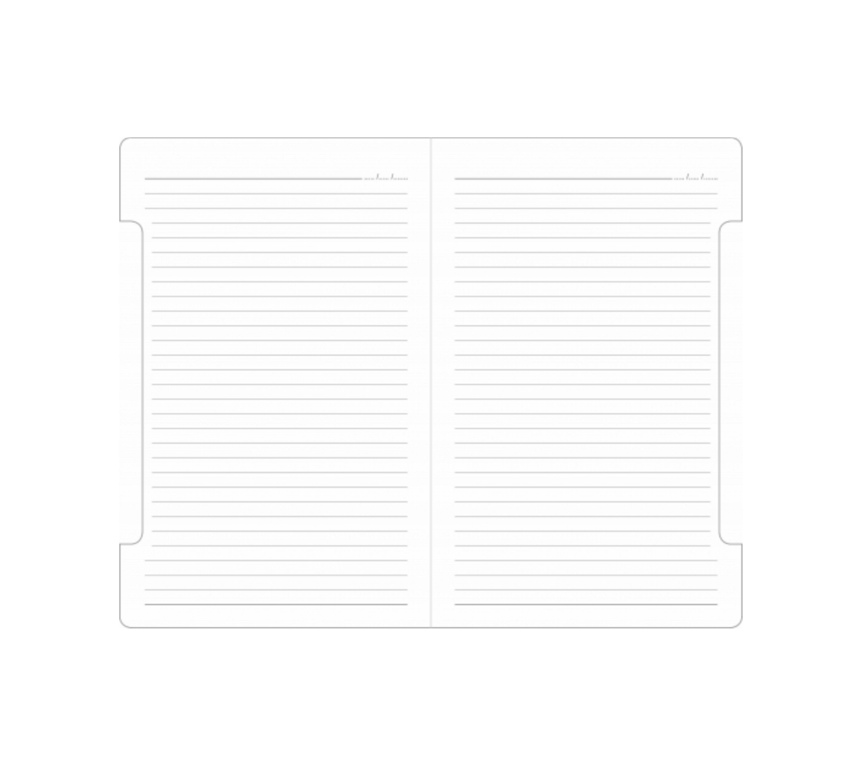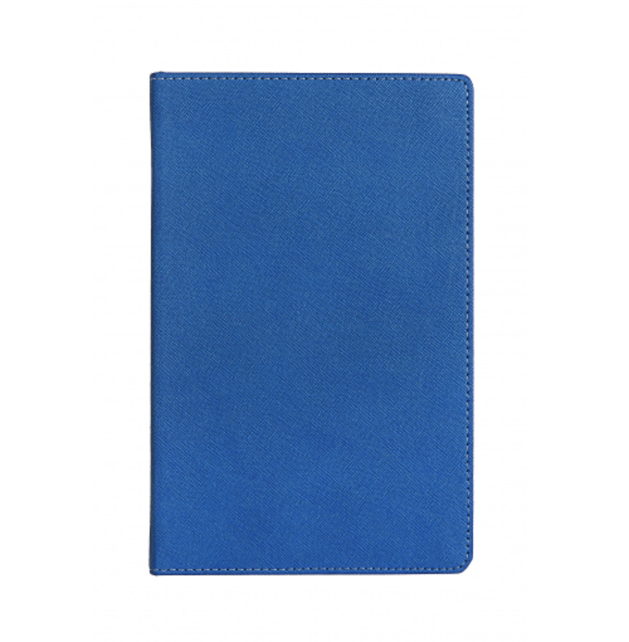 Недатированный блокнот A5 формата. Размер обложки 145*210 мм. Размер внутреннего блока 140x204мм. 288 страниц. Бумага 70 гр. Цвет айвори. Ляссе, крепление для ручки и эластичная резинка одного цвета. Конверт на заднем эрзатце.