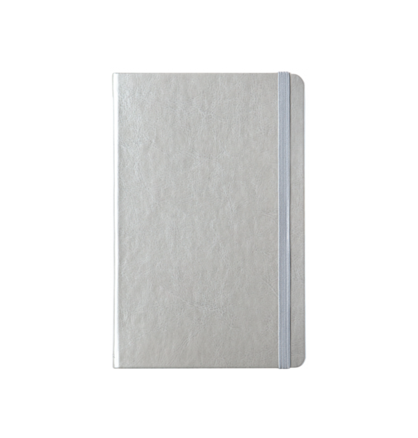 Блокнот на резинке формата А5. Твёрдая обложка с приятной фактурой из качественного кожзама, углами закругленной формы, ляссе в цвет обложки, петля для ручки – наделяют блокнот практичностью. Блок в линейку, 160 стр., изготовлен из бежевой бумаги плотностью 70 г/кв.м. Карман на внутренней стороне обложки. Упаковка - слив-бокс.