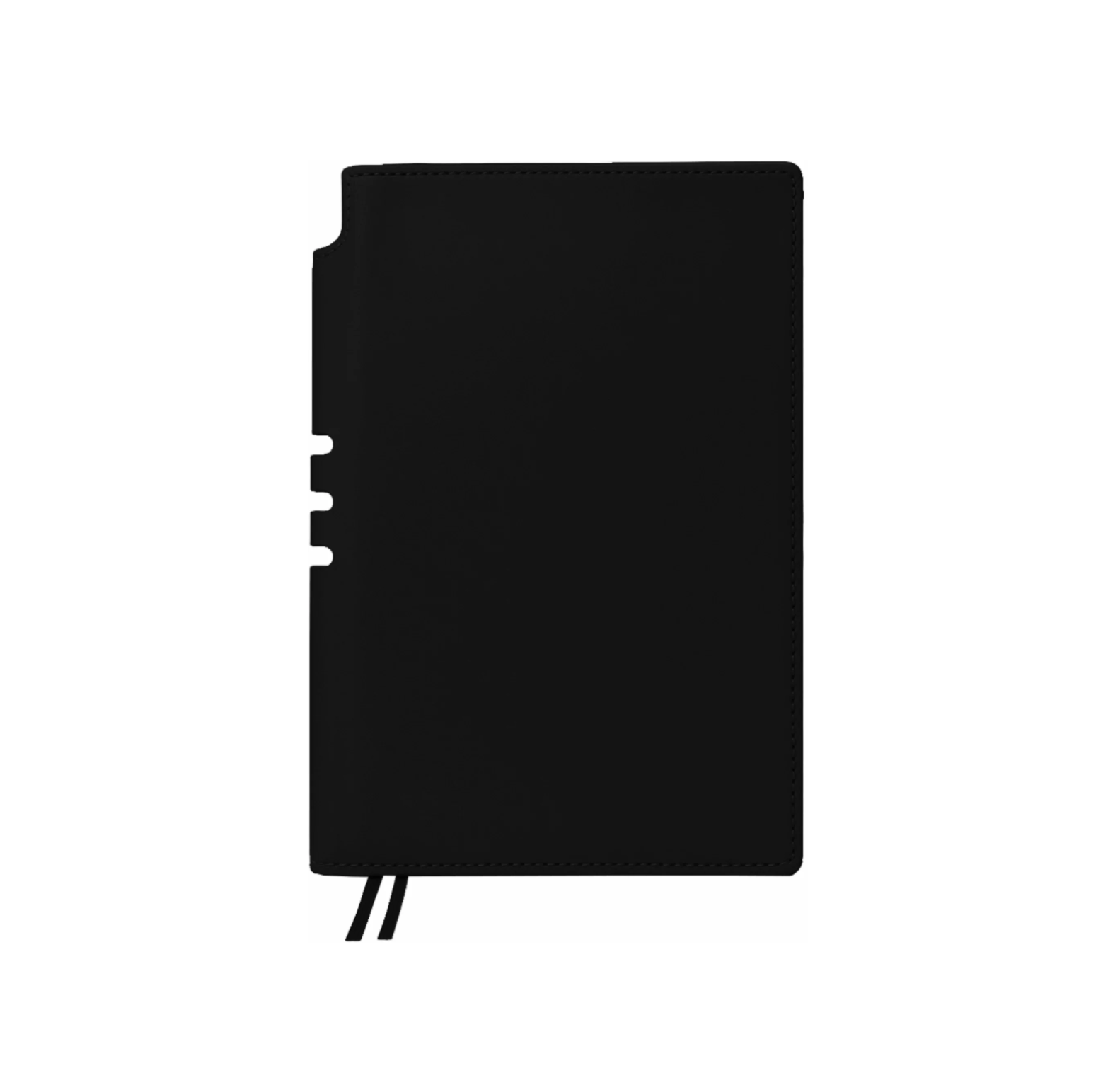 Особенности модели: Боковая прорезь для ручки, окрас бокового среза в цвет обложки, бумажный карман для хранения записей, стикеры в кармашке.