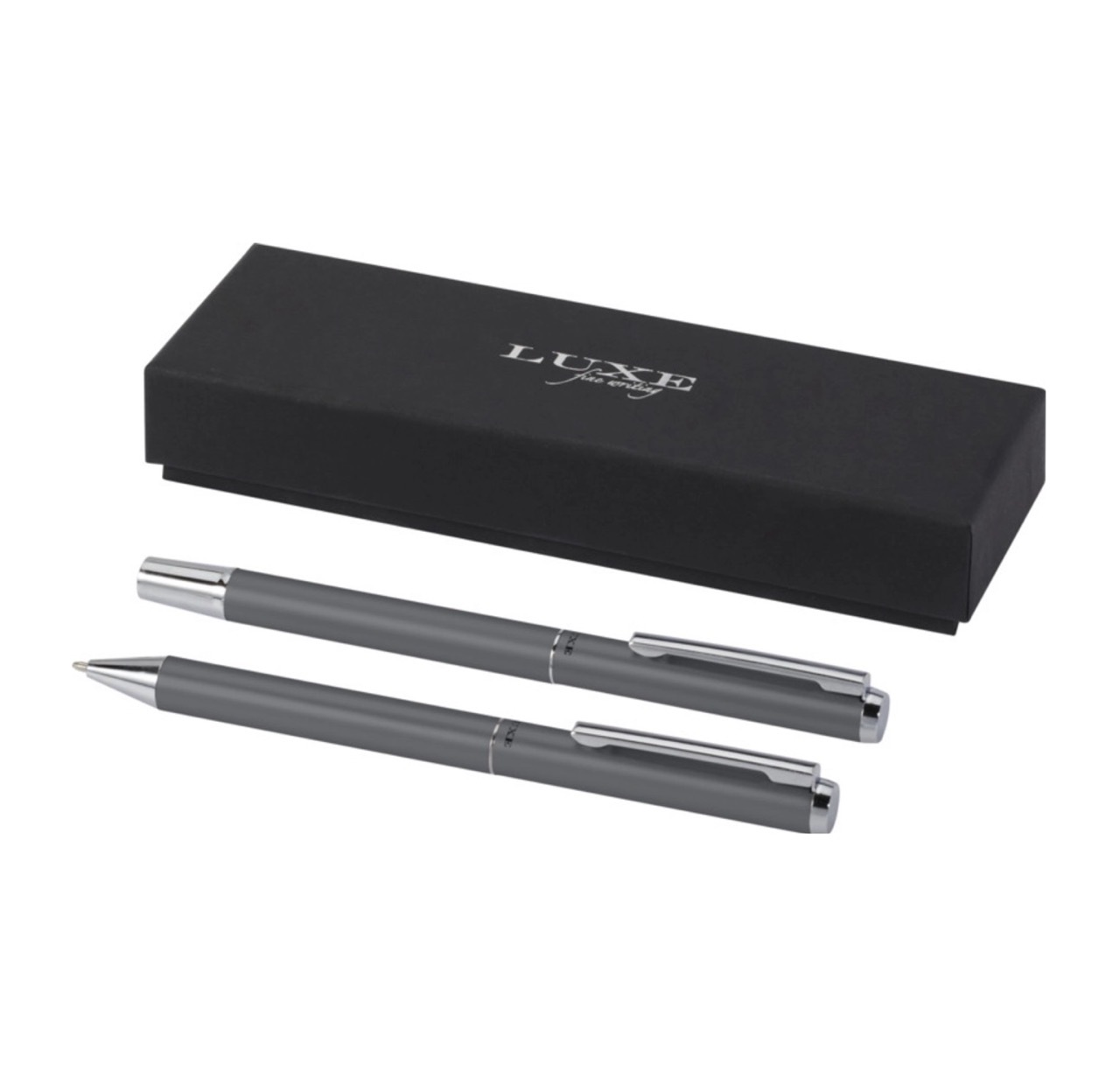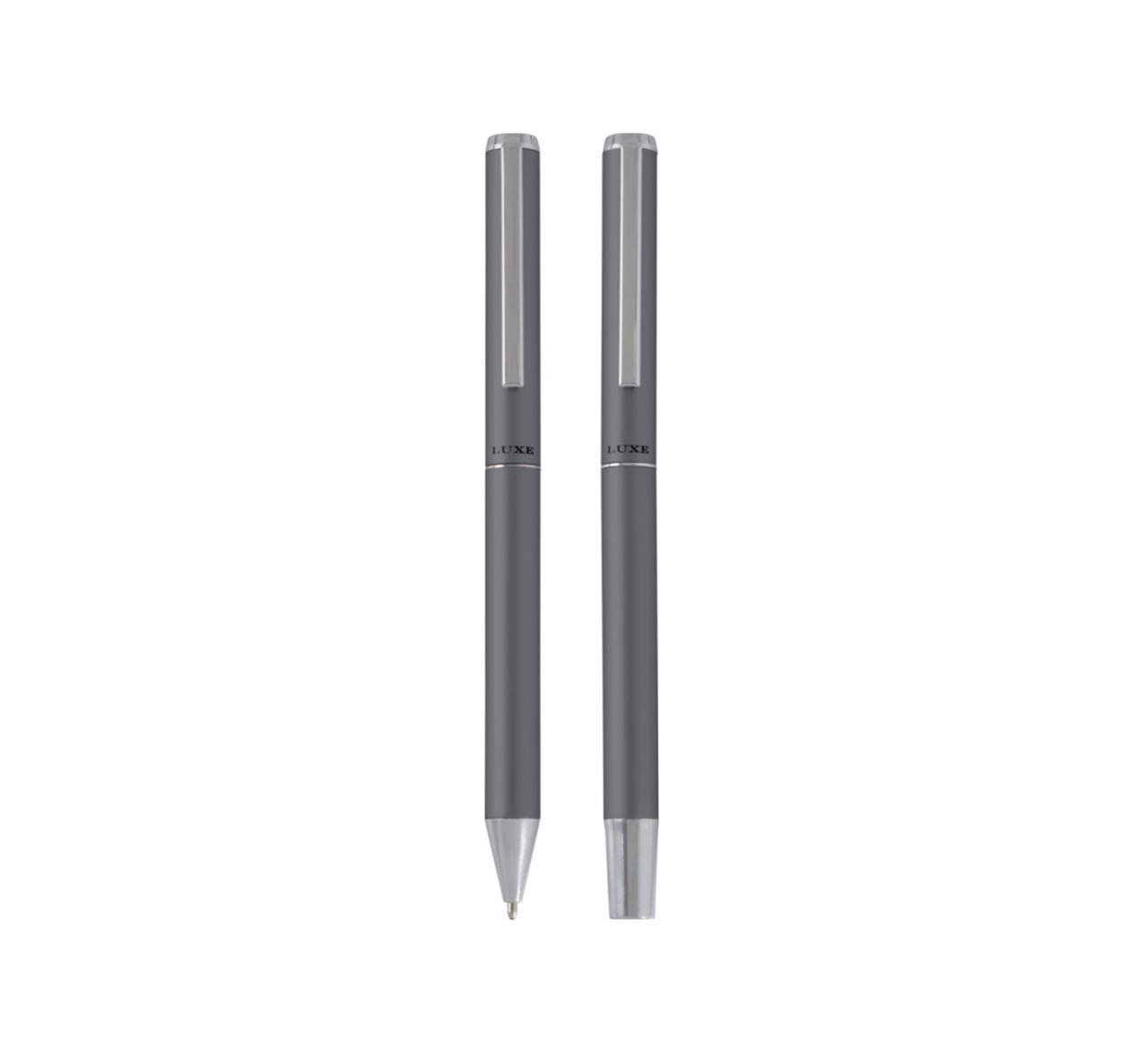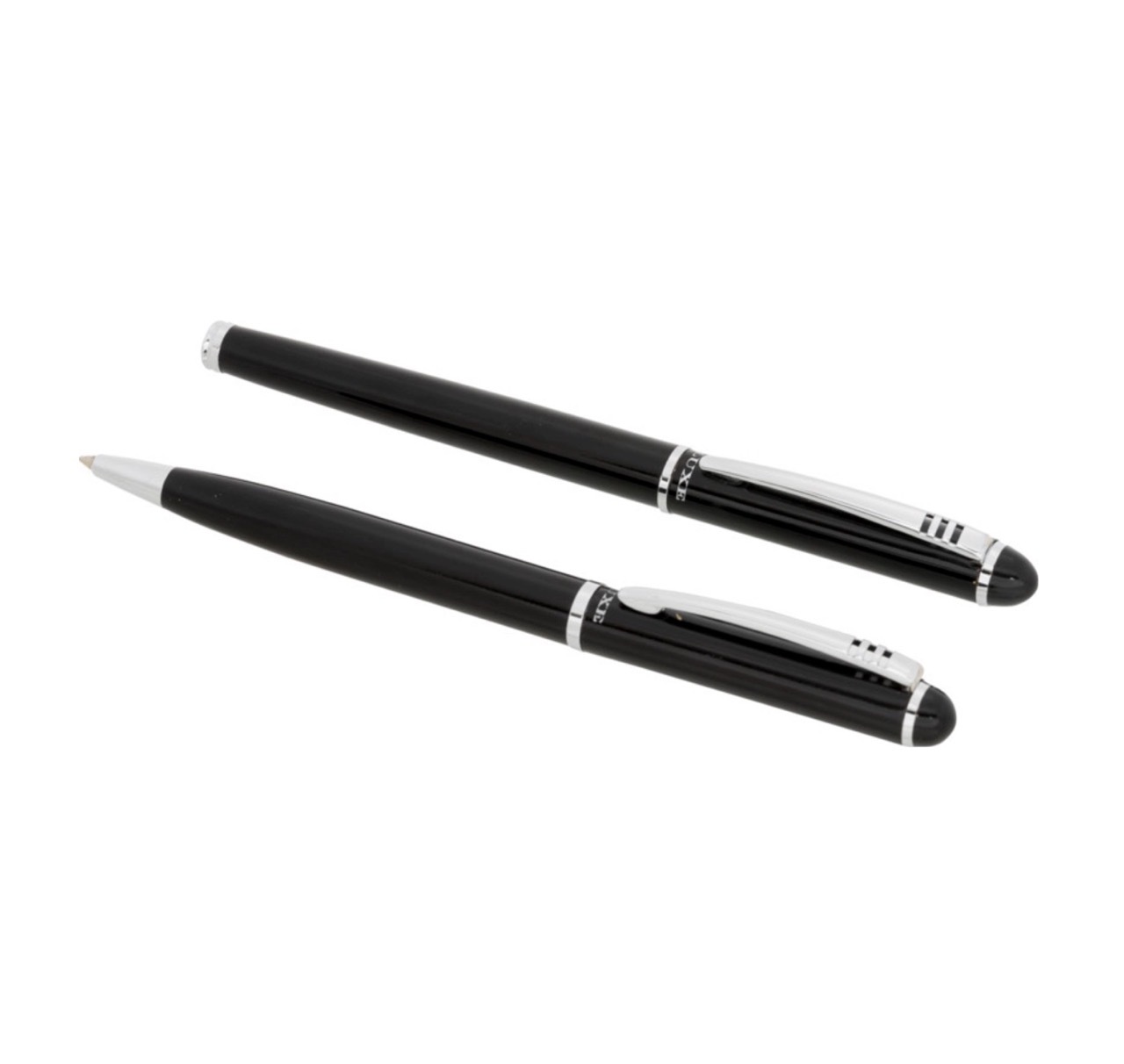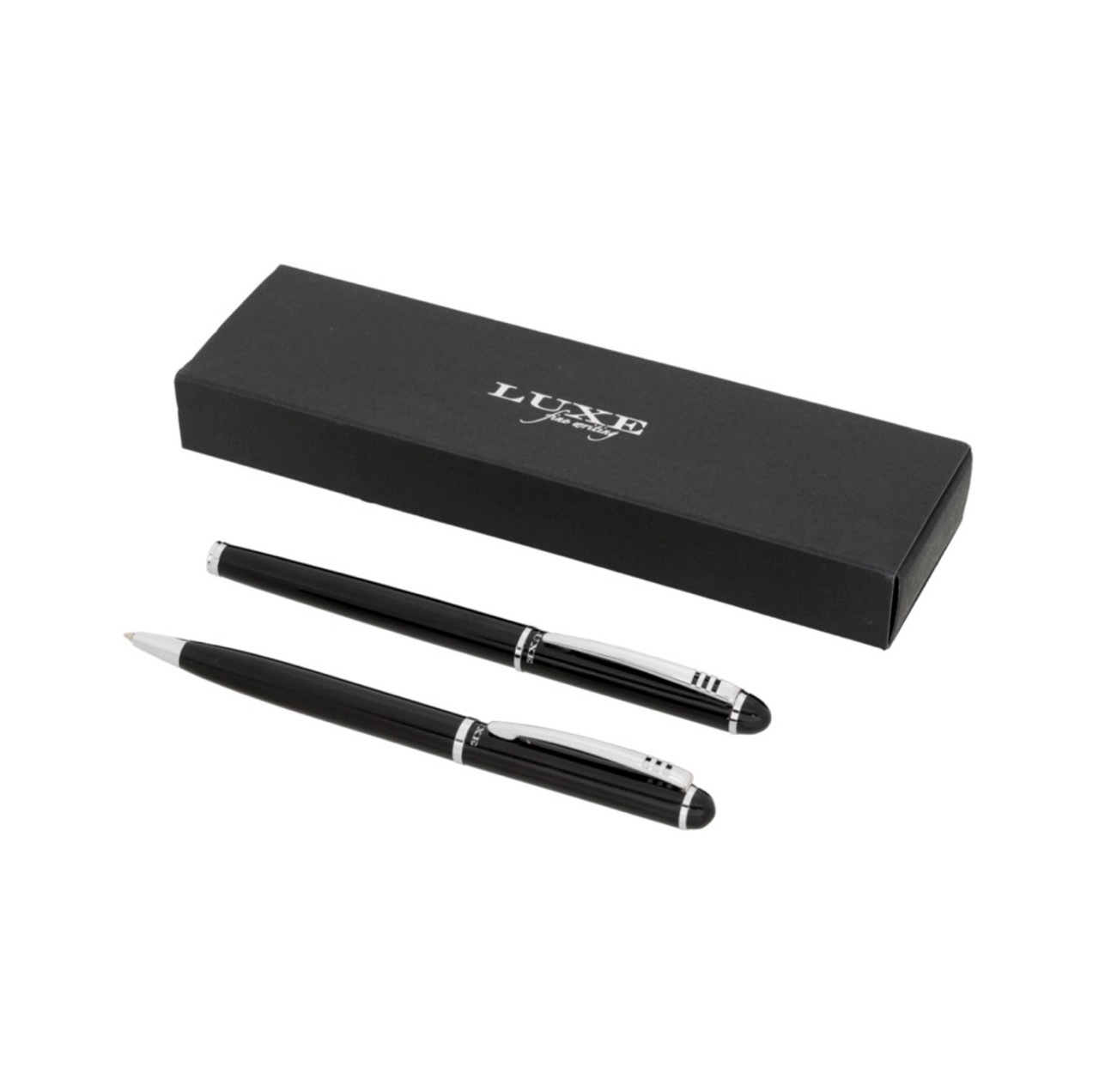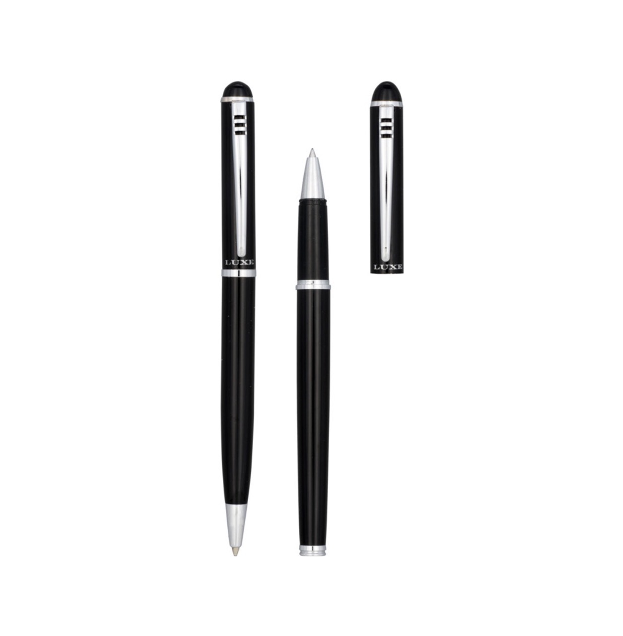 Эксклюзивный набор с шариковой ручкой с поворотным механизмом и ручкой-роллер с колпачком. Предлагается глянцевый черный, матовый серебряный и матовый синий цвета. Предлагается в подарочной коробке LUXE. Металл.