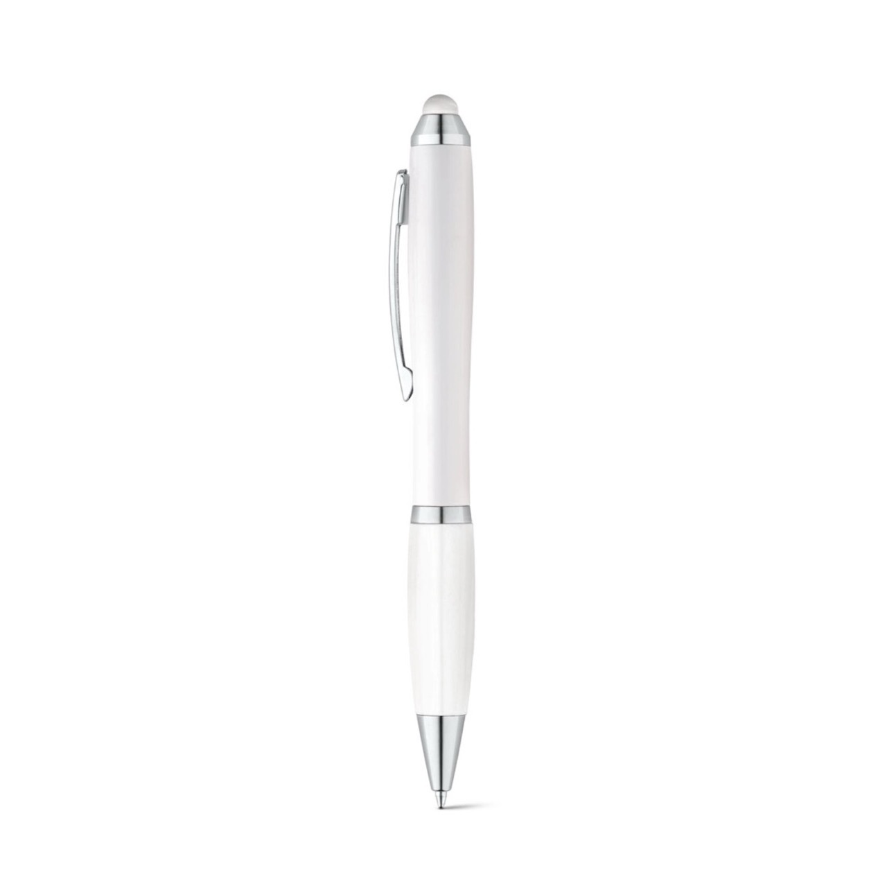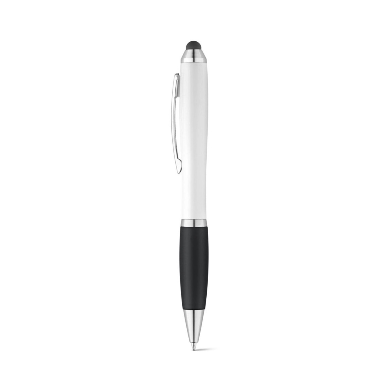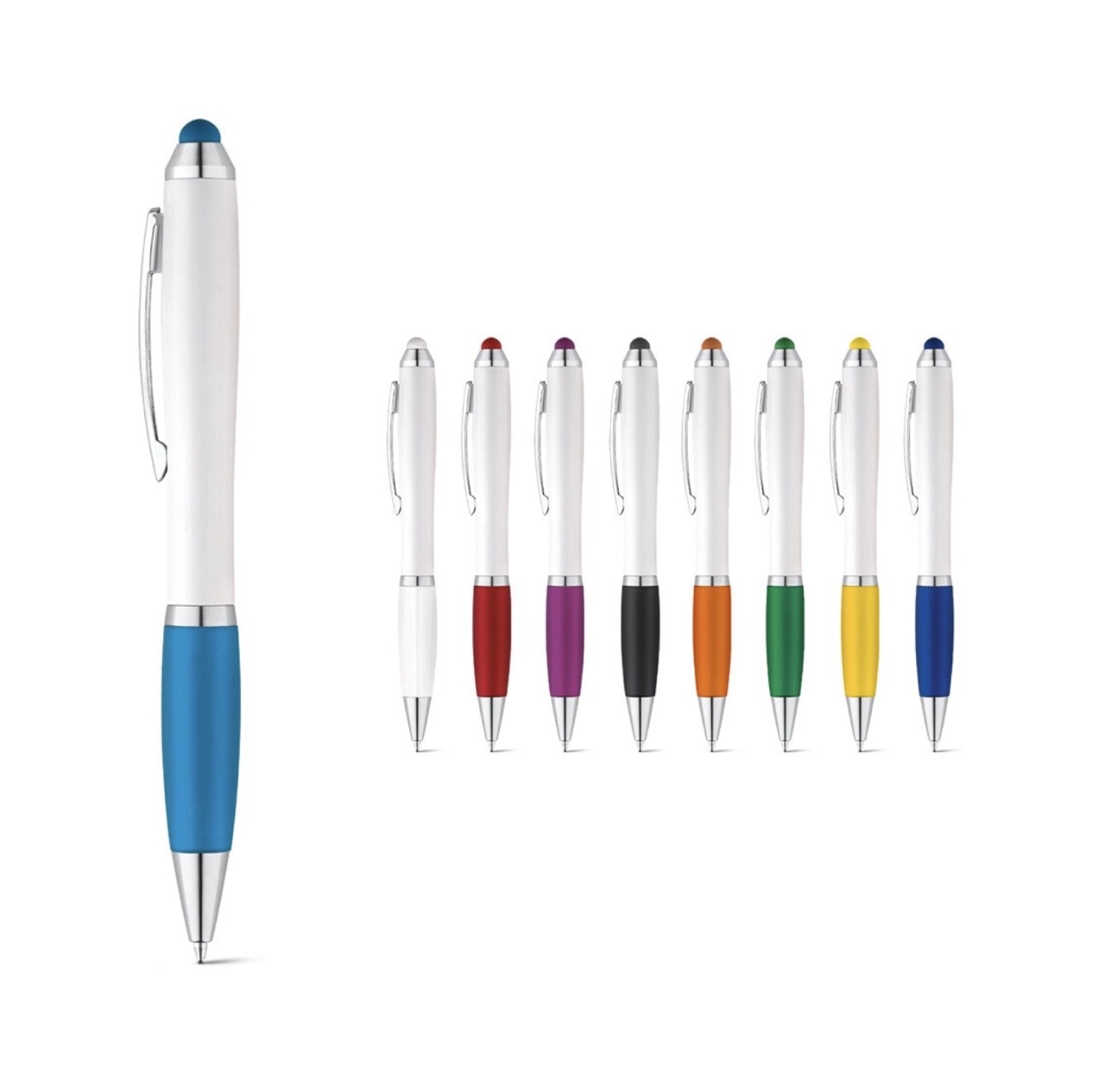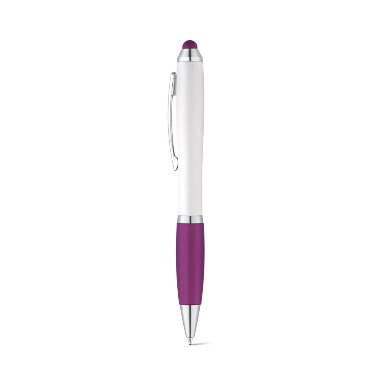 Алюминиевая шариковая ручка, с большим наполнителем, стилусом для сенсорных экранов, матовая поверхность с цветной ocновой для гравировки, соответствующей цвету стилуса.