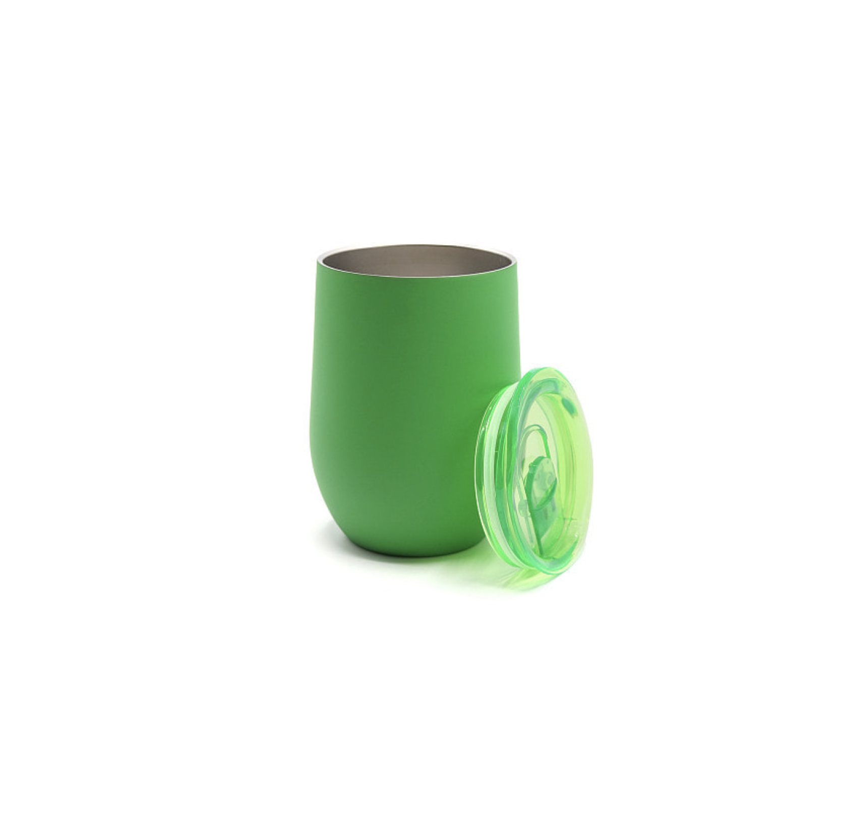 Изящная металлическая термокружка . Внутренние стенки из нержавеющей стали. Внешняя стенка - металл с порошковым покрытием. Крышка пластиковая, цветная. Объём - 420 мл.